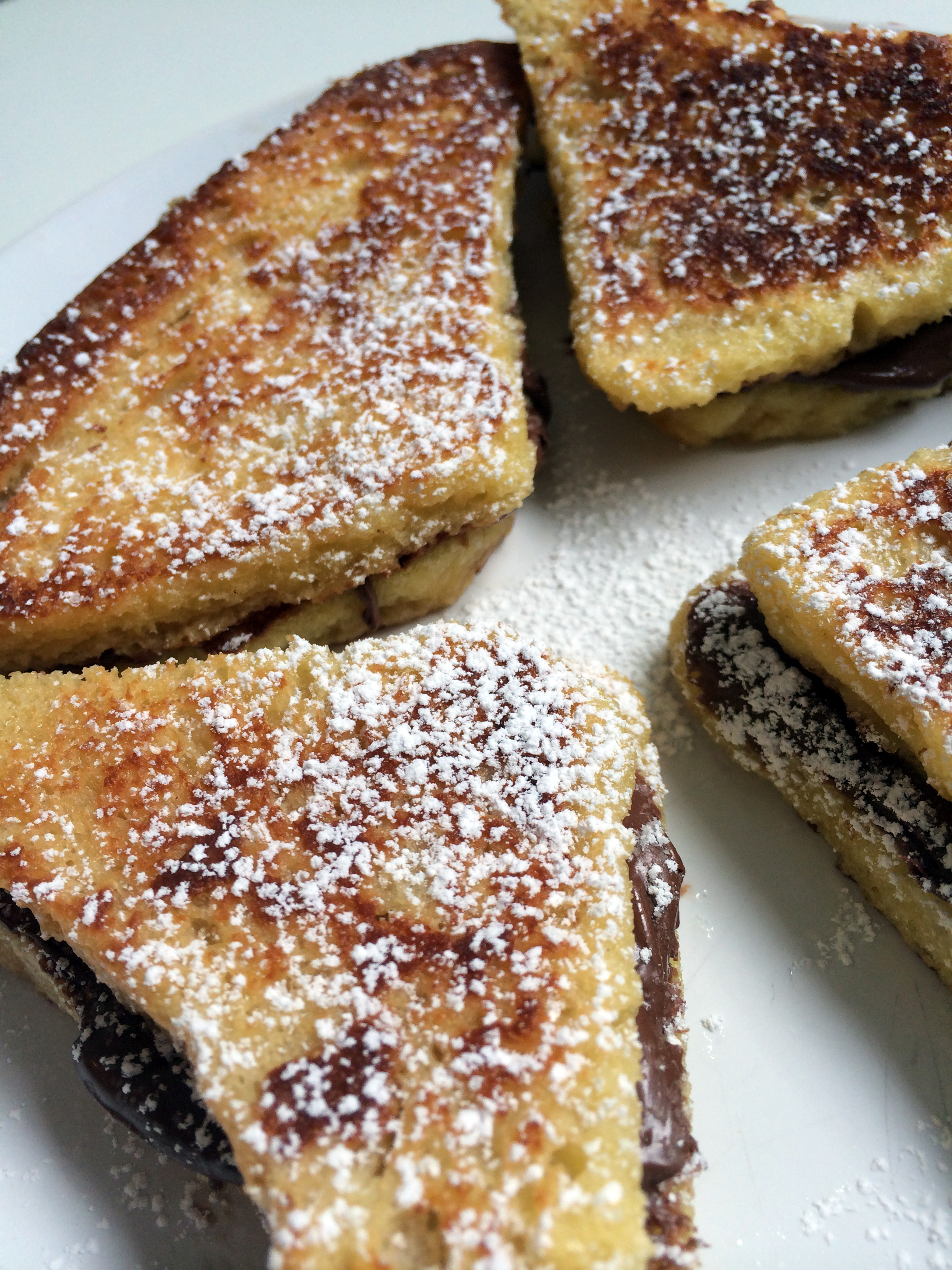 NUTELLA FRENCH TOAST SANDWICHES – adapted from Fine Cooking’s The Best of Breakfast 2011; makes 3 sandwiches